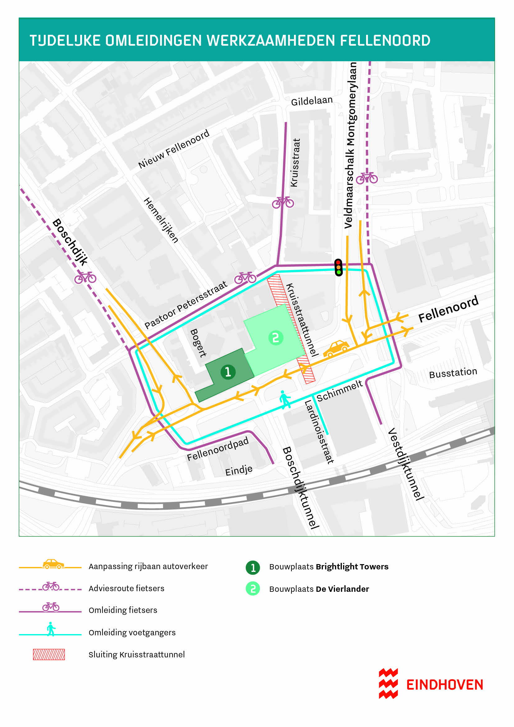 Bij de sluiting van de Kruisstraattunnel gaan fietsers en voetgangers via de Pastoor Petersstraat, de Montgomerylaan en de Boschdijk. Bij de Montgomerylaan komen extra verkeerslichten voor het oversteken. Op het kaartje onderaan deze pagina zie je hoe de omleidingen eruit zien.