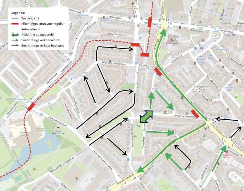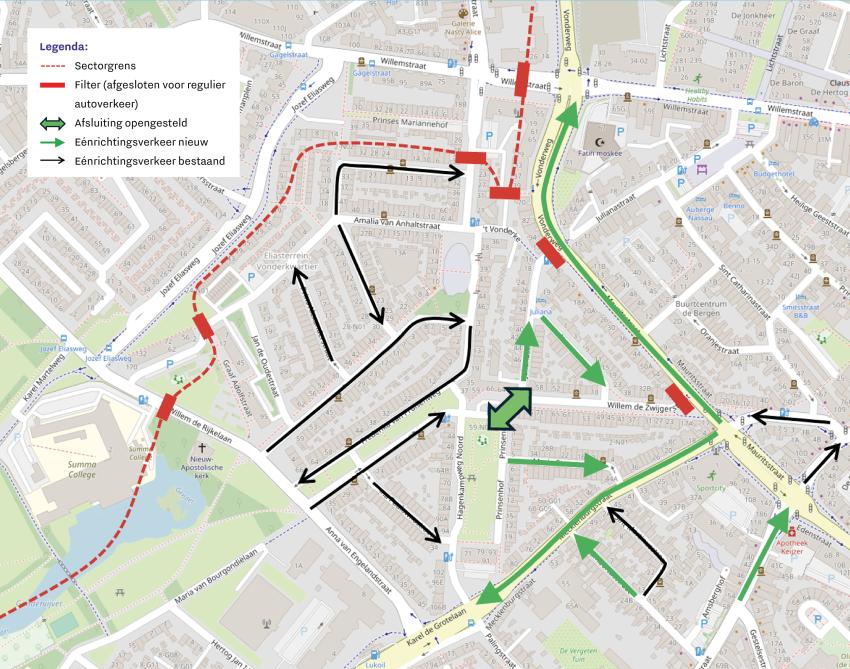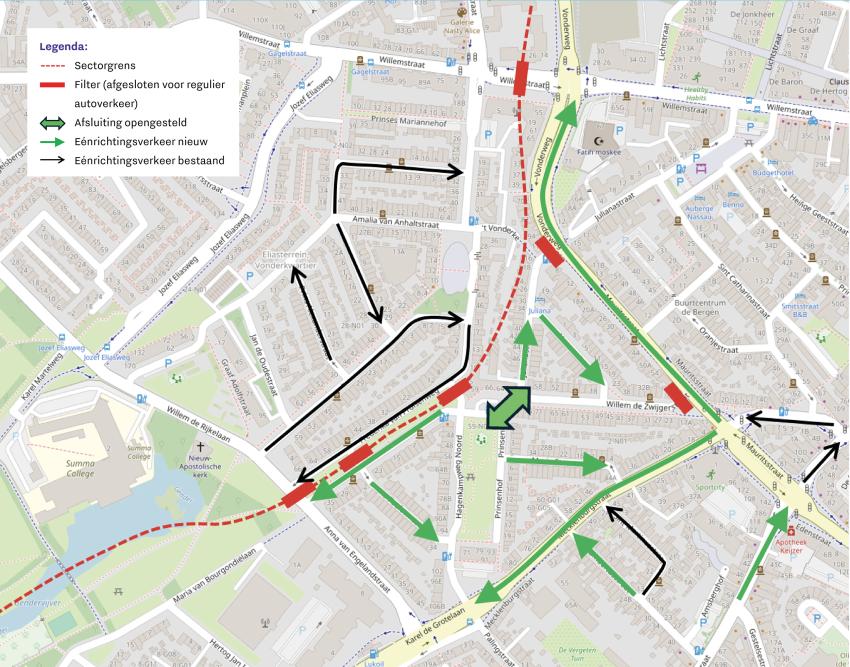 - De bestaande afsluiting voor autoverkeer tussen Willem de Zwijgerstraat en Prinsenhof wordt opengesteld.